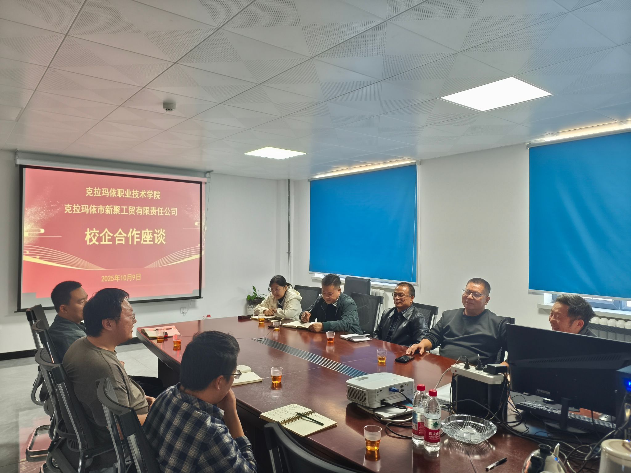 在克拉玛依市新聚工贸有限责任公司(以下简称“新聚公司”),校企双方围绕石油行业实际需求,聚焦三大核心议题展开深入探讨:一是高效驱油剂在油田生产中的实际应用场景与优化方向,结合企业生产数据交流技术改进思路;二是校企共育技能型人才的具体路径,就课程体系对接企业岗位需求、实践教学基地建设等内容交换意见;三是实习生招聘计划,明确企业岗位需求与学生培养目标的匹配要点。