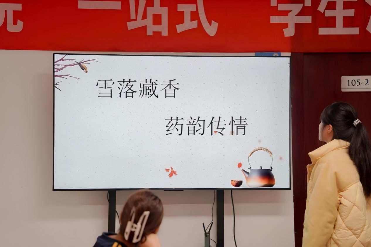活动伊始,讲解人张宵以“雪落藏香,药韵传情”为主题,用通俗生动的语言解读大雪节气特点——气温显著下降、降雪概率增大且雪量渐增,详细介绍了“藏养进补”等民俗传统。“大雪过后人体阳气渐收,佩戴由肉桂等暖性中草药制成的香牌,既能驱寒避秽,又能安神助眠,这是老祖宗流传千年的养生智慧。” 随后,张宵带领同学们认识常见中草药,普及节气养生知识,让大家快速领略中草药文化的深厚底蕴。