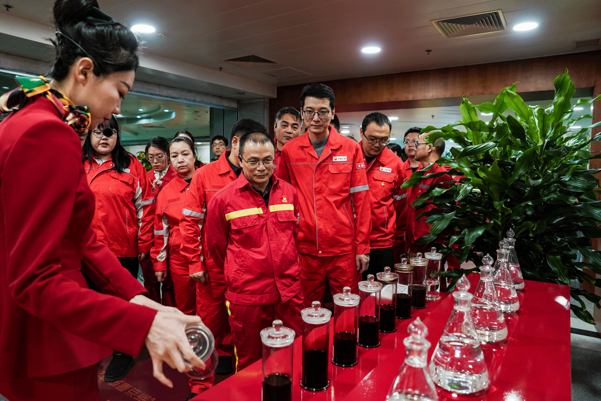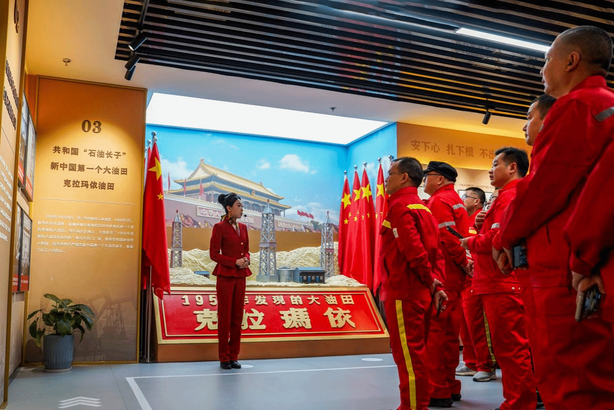 师生党员身着红色工装,在讲解员引导下聆听油田发展历程