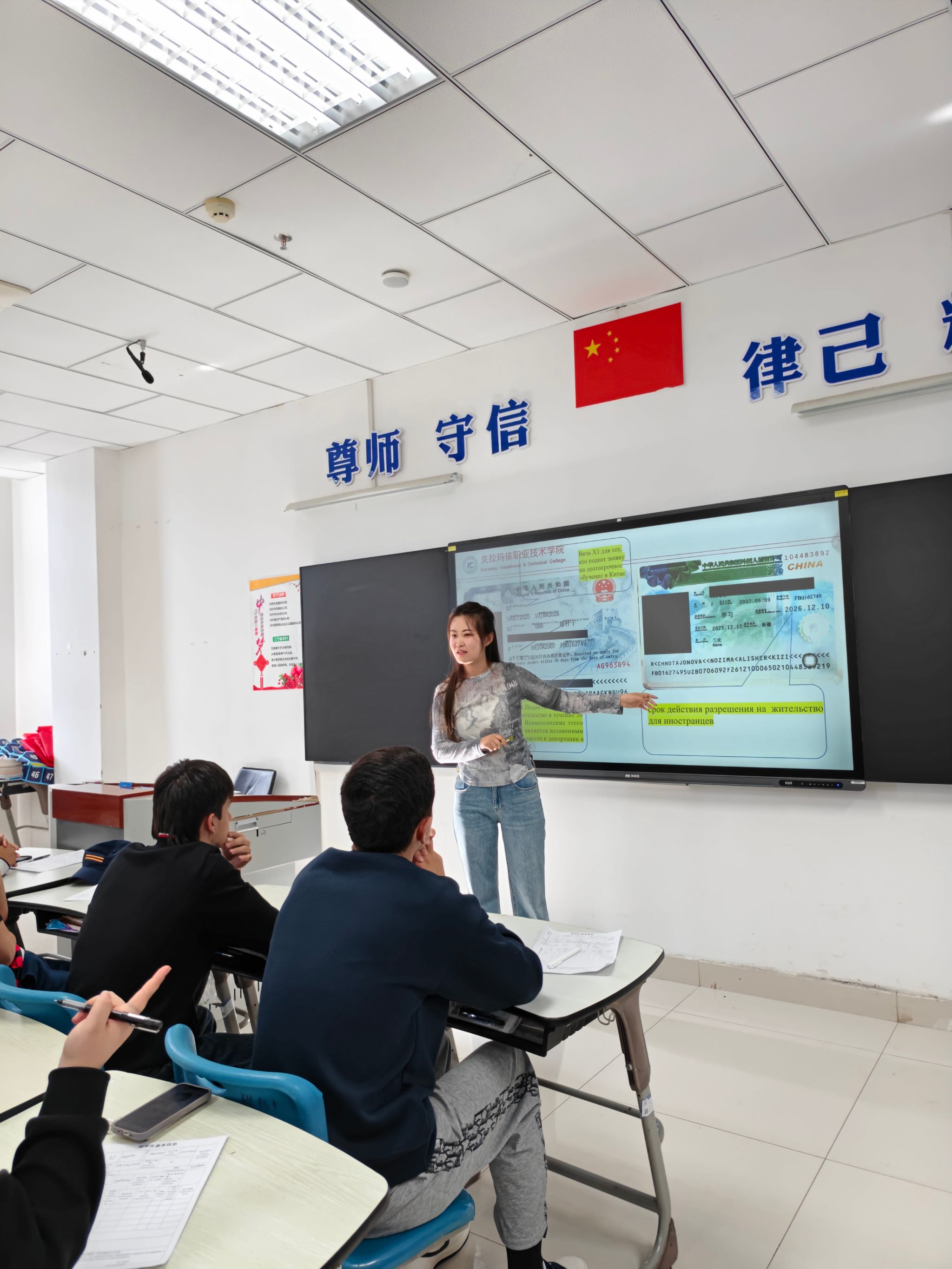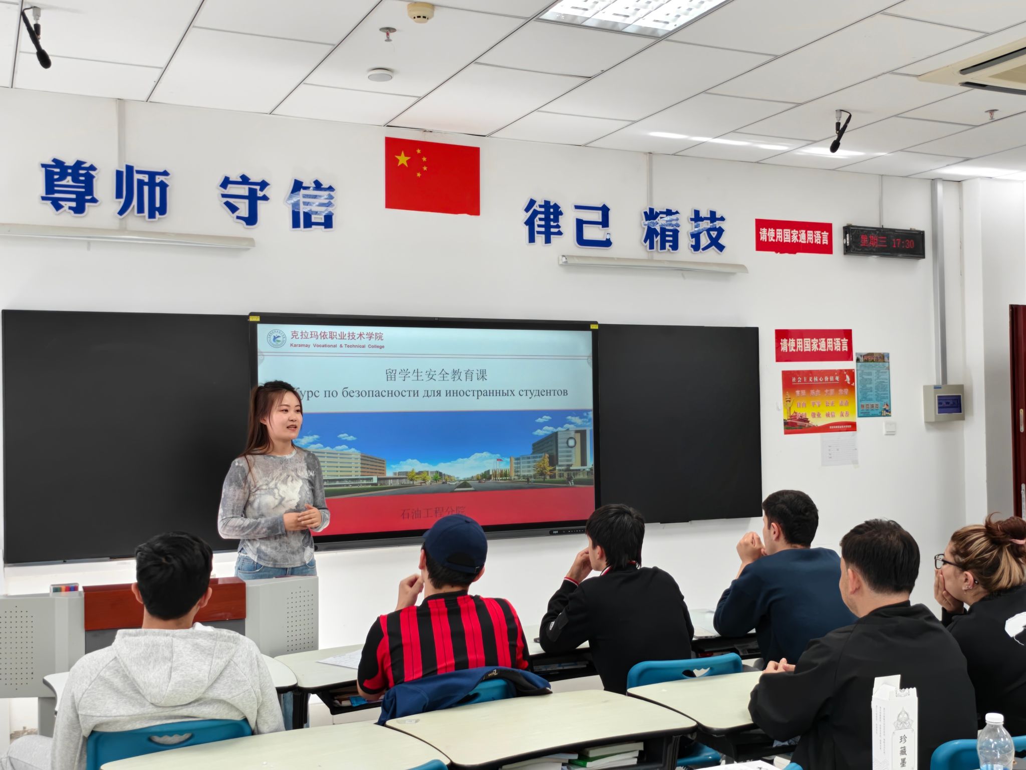 安全教育内容覆盖《中华人民共和国外国人入境出境管理条例》《克拉玛依职业技术学院学生违纪处分办法》《克拉玛依职业技术学院人才培养方案》及反诈宣传等模块,帮助留学生快速掌握在华法律法规,明确在校学习的节奏与要求。结合留学生日常学业、生活中的真实场景,将校规校纪与法律条文转化为警示案例,让留学生更能直观的理解学生行为规范,强化法律认知。