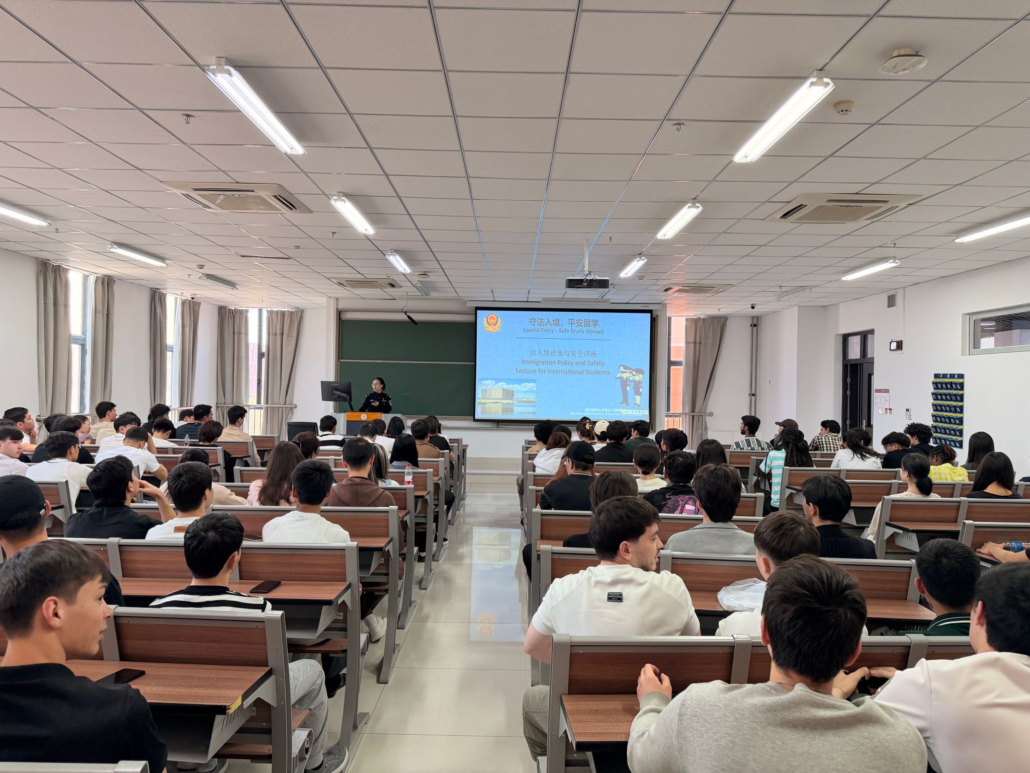 系列活动期间,分院联合中国石油大学(北京)克拉玛依校区邀请克拉玛依市公安局出入境管理支队带来“守法入境,平安留学”专题讲座。警官围绕出入境管理法原则、“三非”(非法入境、非法居留、非法就业)风险、住宿登记流程、签证续签规范等核心内容展开讲解,案例生动、内容实用,课堂互动踊跃、气氛热烈,留学生们纷纷记录要点。
