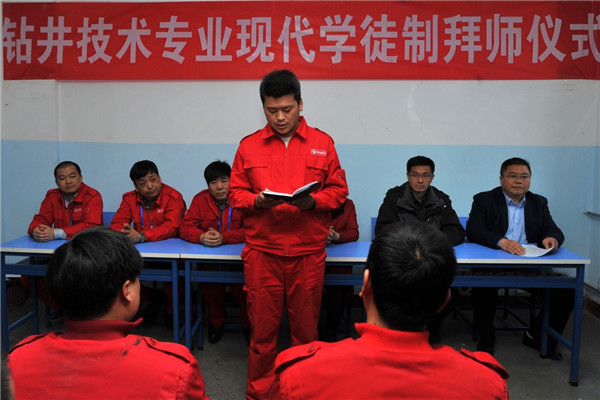 4月8日,克拉玛依职业技术学院石油工程系钻井技术专业在克拉玛依市地质工程有限责任公司百口泉基地举行钻井技术专业现代学徒制拜师仪式。