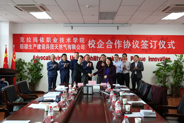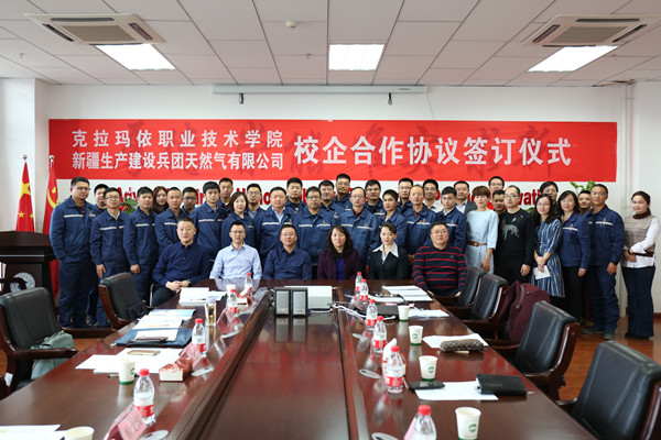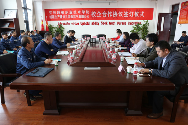 为深入贯彻落实党的十九大精神,落实国家教育部《职业学校校企合作促进办法》要求,深化产教融合、校企合作,2018年3月15日下午,克拉玛依职业技术学院与新疆生产建设兵团天然有限公司校企合作签约暨实训基地授牌仪式在石油工程系会议室举行。