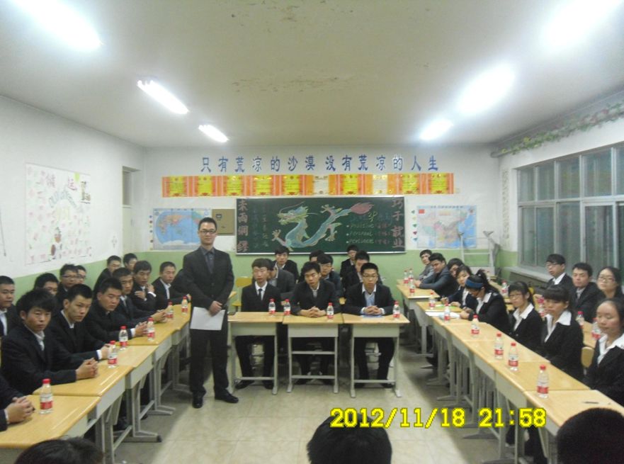 主题班会的第三项邀请西部管道公司独山子分公司人事科郗涛科长给大家讲解了市场化用工、劳务派遣工、正式工的含义和现在国企私企的用工形式。之后给大家讲解了如何择业、扩大自己的信息渠道和在面试中的技巧。并提倡大家先就业,后择业。最后一项是由郗科长对大家进行随机模拟面试和简历评比活动,并真对在模拟面试和简历中的不足提出建议让大家改正,使大家能够在细节中完善自己,在真正的面试中取的胜利。最后郗科长衷心祝愿储运1031班的所有同学都能够找到自己满意的工作。