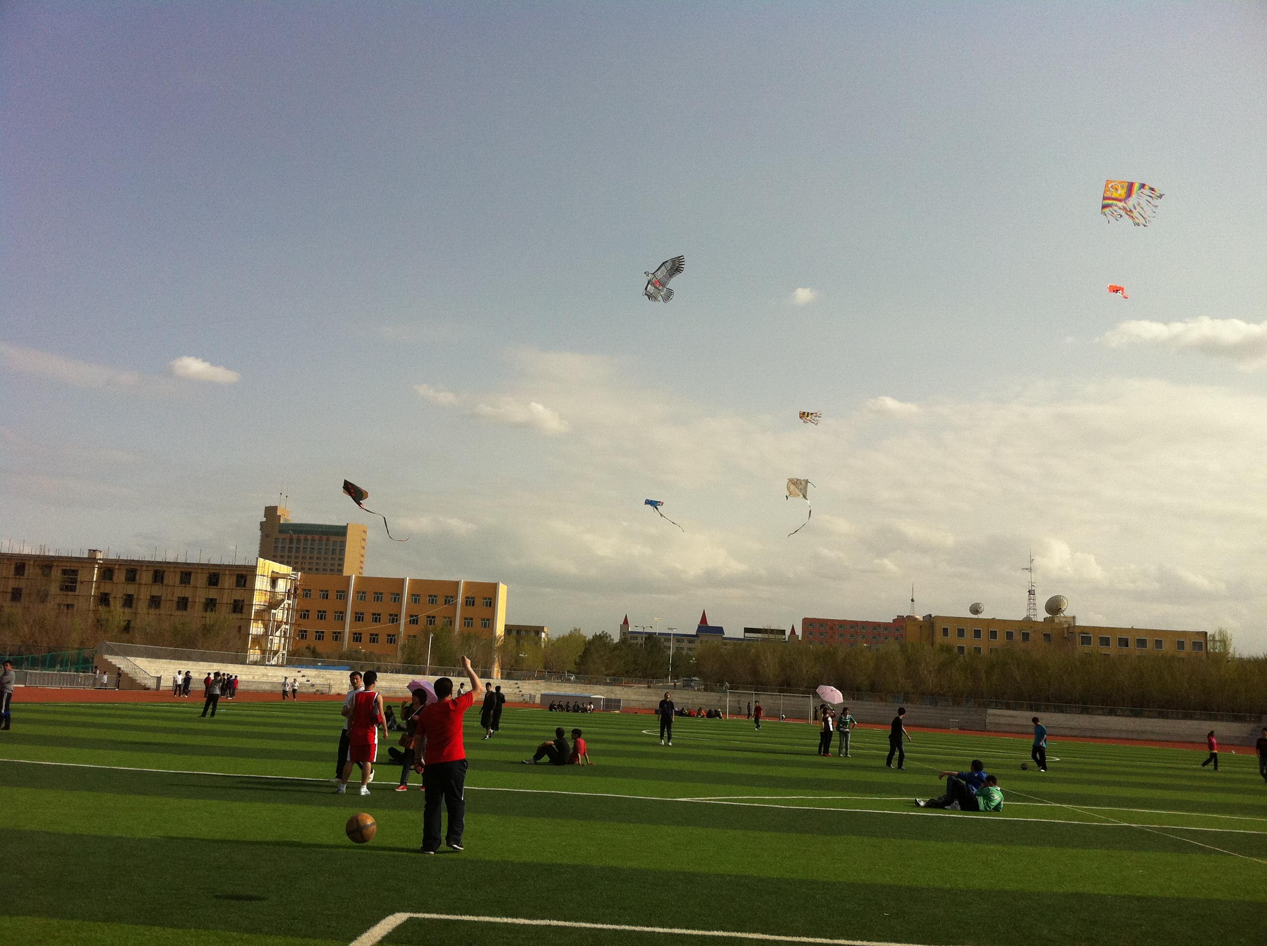 春风和煦,阳光明媚。4月19日下午,在学院的运动场上石油工程系团总支成功举办了以“我爱四月的风”为主题的风筝比赛,石油工程系党支部书记蒋定建老师、系团总支书记张思圆老师、系辅导员刘志强老师、地质0931班班主任狄娜老师以及系团总支委员和系学生会干部作为评委参与了本次活动。简短的开幕式过后,赛场上五颜六色的风筝展翅翱翔,在春风的吹拂下,它们仿佛是一只只五彩缤纷的蝴蝶,把天空点缀的更加美丽。在活动过程中各小组的同学团结协作,赛场上气氛活跃,同学及老师们都尽情的加油,呐喊,欢呼,沉浸在这短暂而有意义的活动中!金色的阳光给天空中飘扬的一只只风筝镶上了耀眼的金边,放飞风筝,放飞季节,放飞梦想,放飞快乐的心情!