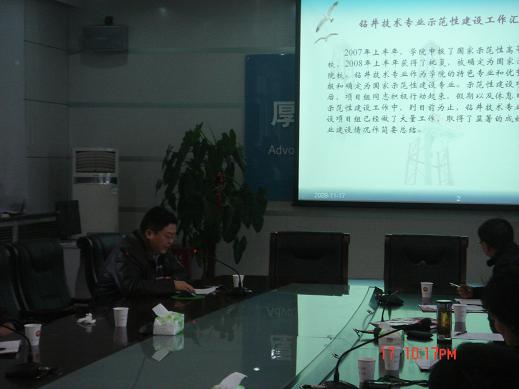 2009年11月17日上午在机关一楼会议室举行了“钻井技术专业示范性建设工作汇报”。这次检查是为了进一步落实学院示范性院校建设各项目组建设项目的完成情况,按照示范性建设领导小组的要求与指示,学院示范性建设质量监控组将按照《国家示范性高等职业院校建设方案》和《国家示范性高等职业院校建设任务书》所承诺的建设项目对各示范性建设小组前期的建设情况进行检查和验收。钻井技术示范性建设小组向学院示范性建设领导小组进行了细致的汇报。